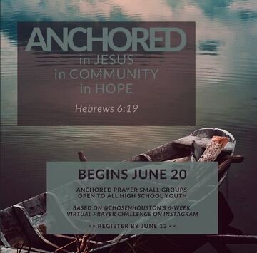 The first is Anchored, a weekly small group for community and prayer! We will be talking about hope. It will be a virtual study at first but could move to in person if things open up more. This is very flexible, so still sign up if you’re working, in school, or busy this summer! This is open to all...